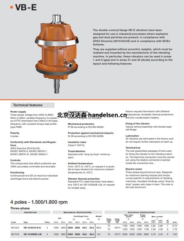 Italvibras 雙錐形法蘭 VB-E 振動(dòng)器設(shè)計(jì)用于具有由氣體和灰塵引起的潛在爆炸性環(huán)境的工業(yè)過程,符合 ATEX 指令 (94/9/EC)。它們不帶偏心重物,必須由振動(dòng)機(jī)制造商實(shí)現(xiàn)和安裝。特別是,這些振動(dòng)器可用于區(qū)域 1 和 2(氣體)以及區(qū)域 21 和 22(灰塵)。
